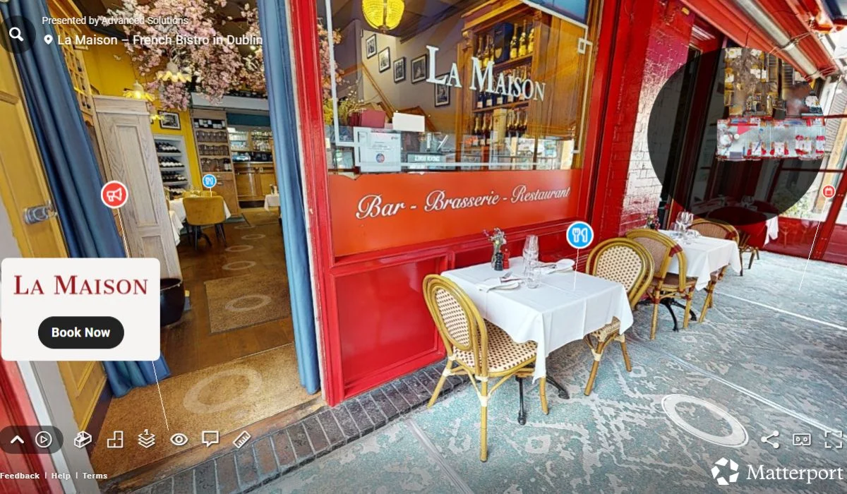 Step inside La Maison and explore the atmosphere of this French-inspired restaurant in the heart of Dublin. This 3D virtual tour offers a full view of the dining areas and interior layout before you even walk through the door.