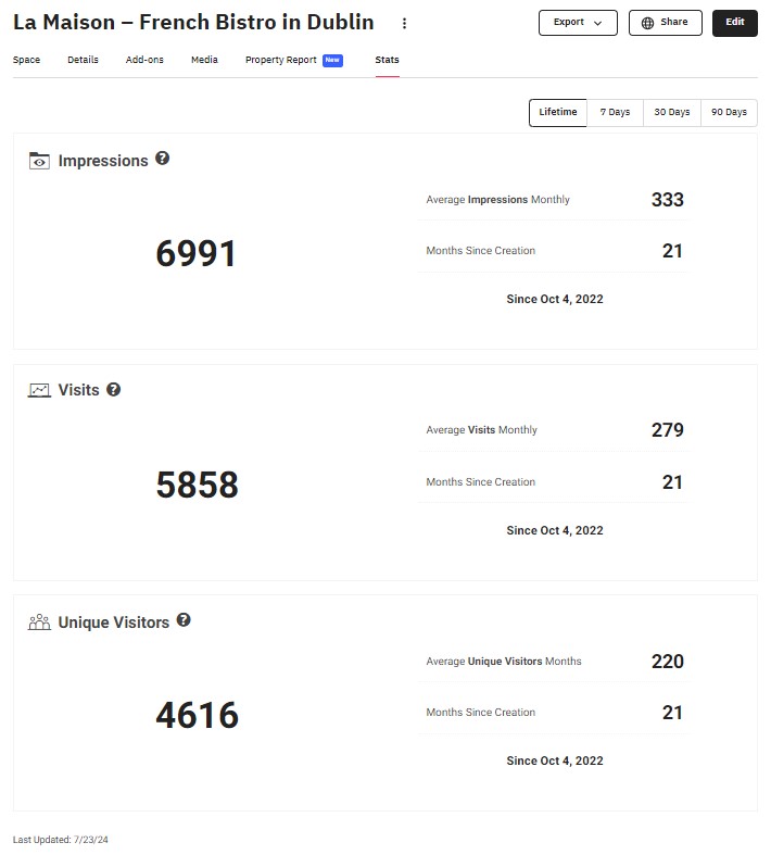 The first La Maison virtual tour achieved over 6,900 impressions, 5,800 visits and 4,600 unique visitors within its first 21 months, demonstrating strong engagement and visibility before the restaurant’s renovation and launch of the new tour.